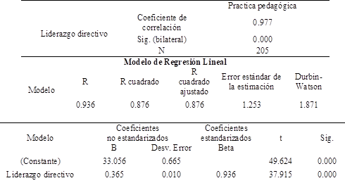Existe una fuerte correlación positiva entre liderazgo directivo y la práctica pedagógica, a medida que una variable aumenta, la otra tiende a aumentar en un 93.6%. El 87.6% de la variación del practica pedagógica, se puede explicar con el modelo de regresión simple: MODELO: y=33.056+0.365X mediante la prueba no paramétrica Rho de Spearman se obtuvo un coeficiente de correlación de 0.977, el cual indica que existe una correlación positiva y alta, por lo que, a mayor liderazgo directivo, mayor será el practica pedagógico. En adición, se rechazó la hipótesis nula y se aceptó la hipótesis alterna ya que hay un valor de probabilidad (p = 0.000) inferior al valor 0.05.