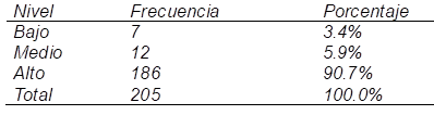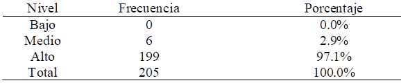 Respecto al nivel de práctica pedagógica, el 0,0% de docentes muestran un nivel bajo, mientras que el 2,9 manifiestan que existe un nivel medio (6 docentes); y finalmente, el 97,1% expresan que existe un nivel alto (199 docentes).