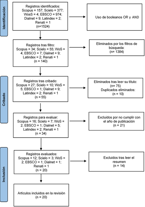 Aplicando los criterios de exclusión y de inclusión, se utilizaron los motores de búsqueda y operadores booleanos, lo que permitió identificar 140 artículos que consideraban la evaluación formativa en el título, se procedió a leer cada título y se desestimaron 75 artículos por considerarse que no tenían relación con el objetivo de estudio; además, también se excluyeron 10 artículos duplicados. Se leyeron los resúmenes de los 34 artículos seleccionados luego del cribado y se eliminaron 4 artículos más, quedando seleccionados 20 artículos para la revisión sistemática.
