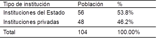 Por otra parte, la población está constituida por los miembros de un mismo grupo que cumplen con las restricciones establecidas en la investigación. Según (Hernández-Sampieri y Mendoza 2018), la población se define como todas las instancias de un fenómeno que comparten algún rasgo, que es el objeto de la investigación y la base de los datos recolectados de dicho estudio. En total, se evaluaron 104 entidades ubicadas en la región de Lima; 56 de ellas eran organizaciones del sector público y 48 eran entes privados con operaciones en la zona seleccionada (Tabla 1).