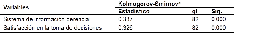 Los resultados de la prueba de normalidad de Kolmogorov-Smirnov se utilizaron para determinar si los datos seguían una distribución normal. Esto a su vez, dicta si el estudio utiliza un análisis estadístico inferencial paramétrico o no paramétrico. Los valores calculados para las variables sistemas de información gerencial y satisfacción en la toma de decisiones son 0.337 y 0.326, respectivamente, con un nivel de significancia de 0.000 en ambos casos, como se muestra en la Tabla 5. Dado que el valor p es inferior a 0.05, puede deducirse que los datos de la investigación no se ajustan a una distribución normal. Por eso se emplea el estadístico no paramétrico Rho de Spearman para determinar la correlación de hipótesis