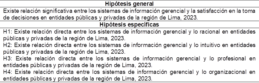 Por consiguiente, la integración de los sistemas de información gerencial de alta calidad puede transformar la manera en que las organizaciones toman decisiones, mejorando la agilidad y la precisión de sus acciones (Nauca & Chávarry, 2020). Por lo tanto, es fundamental conocer la implementación y uso de estos sistemas, no sólo para optimizar la gestión interna, sino también para asegurar una mayor satisfacción de los grupos de interés y, en última instancia, un impacto positivo en la comunidad (Contreras-Díaz et al., 2021). La mejora en estos métodos podría representar un cambio significativo en la forma en que se enfrentan los retos actuales en la región. Partiendo de esta premisa, el estudio tiene como objetivo determinar la relación que existe entre los sistemas de información gerencial y la satisfacción en la toma de decisiones en entidades públicas y privadas de la región de Lima, 2023.