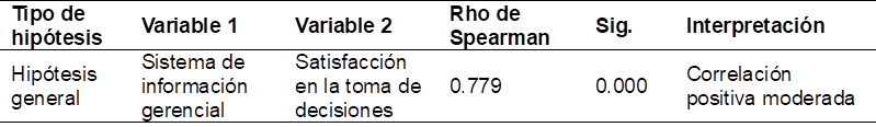 Con una correlación positiva moderada (r = 0.749) y una significancia estadística de 0.000, inferior a 0.05, se establece que la variable sistema de información gerencial está directamente relacionada con la satisfacción en la toma de decisiones. En consecuencia, se acepta la hipótesis principal y se rechaza la hipótesis nula.