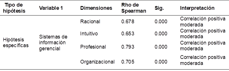 Los resultados mostraron una correlación positiva moderada de 0.678 para la dimensión racional. Del mismo modo, la dimensión intuitiva tuvo un valor de 0.653, la dimensión profesional tuvo un valor de 0.793 y la dimensión organizacional tuvo un valor de 0.705 (correlación positiva moderada). Todos estos valores se obtuvieron con un nivel de significancia (0,000) inferior al valor p = 0.05, por lo que se aceptan las hipótesis alternativas del estudio y se rechazan las hipótesis nulas. En consecuencia, se afirma que existe una relación significativa entre la variable sistemas de información gerencial y las dimensiones de la variable satisfacción en la toma de decisiones: racional, intuitiva, profesional y organizacional, en entidades públicas y privadas de la región de Lima, 2023.