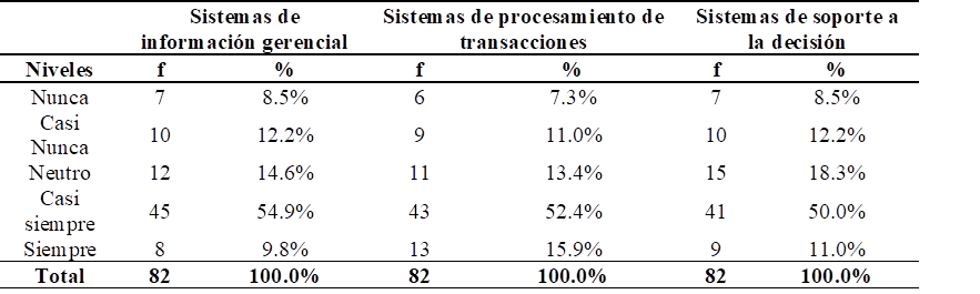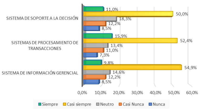 De acuerdo con los porcentajes y niveles que se muestran en la Tabla 3 y Figura 2, los directivos de las organizaciones del sector público y privado de Lima calificaron la variable sistemas de información gerencial y sus dos componentes, el sistema de procesamiento de transacciones y el sistema de soporte a la decisión. Según los resultados obtenidos, el 54.9% de los encuestados manifiestan que casi siempre, se utiliza el sistema de información gerencial en la institución. Asimismo, el 52.4% de los directivos encuestados manifiesta que casi siempre utilizan programas o herramientas específicas para el sistema de tratamiento de las transacciones. Además, el 50% señala que casi siempre, utiliza herramientas TIC para la gestión de informes y el tratamiento de datos, lo que es relevante para el apoyo a la toma de decisiones.