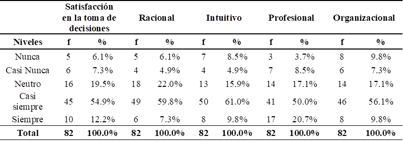 Tabla 4 Análisis de la variable satisfacción en la toma de decisiones y sus dimensiones