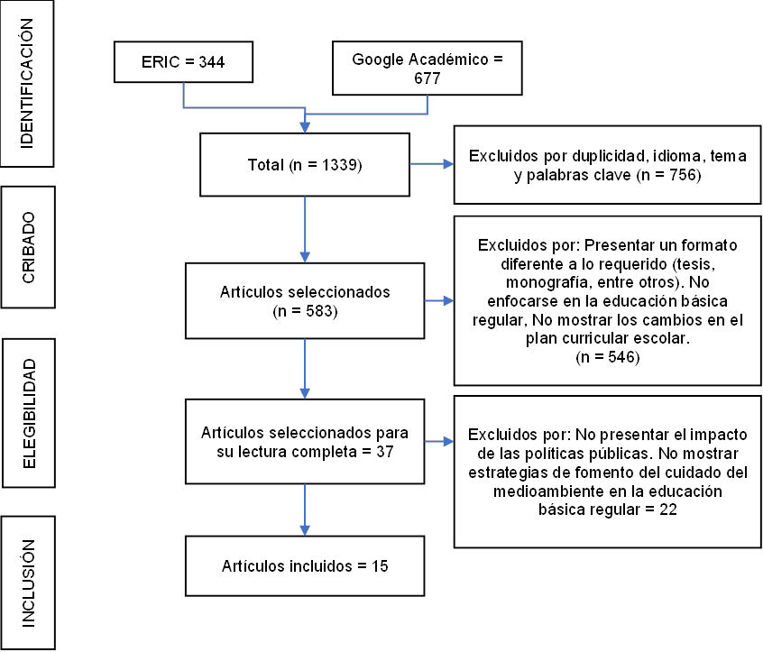 La etapa de elegibilidad se enfocó en los 37 artículos restantes, los cuales fueron evaluados mediante una lectura completa para determinar su pertinencia y calidad. En esta fase se excluyeron aquellos que no presentaban un análisis explícito del impacto de las políticas públicas en la educación ambiental, así como aquellos que no proponían estrategias concretas para fomentar el cuidado del medioambiente en la educación básica regular. Tras este proceso, se seleccionaron 15 artículos que cumplían cabalmente con los criterios establecidos, los cuales fueron presentados para su posterior análisis.