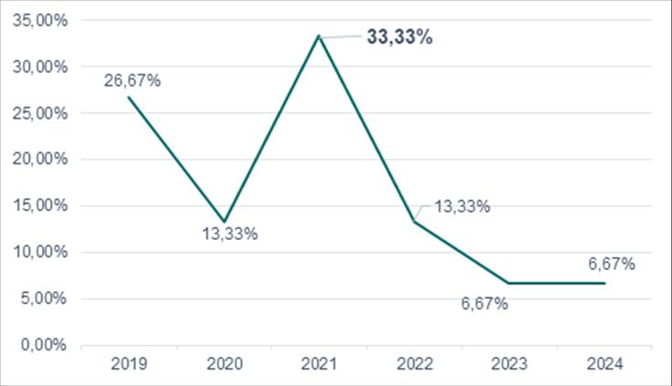 En 2021, la cantidad de los artículos publicados aumenta, nuevamente, al 33.33 %, alcanzando el punto más alto en este intervalo, resaltando un repunte en la actividad investigativa. Sin embargo, a partir de 2022, se observa una caída sostenida, con un 13.33 % de publicaciones en ese año y un descenso más marcado en 2023 y 2024, con solo un 6.67 % en ambos años. Esta tendencia de fluctuación está vinculada a cambios en las prioridades de investigación, en la disponibilidad de recursos o en la evolución de los intereses académicos dentro del campo estudiado.