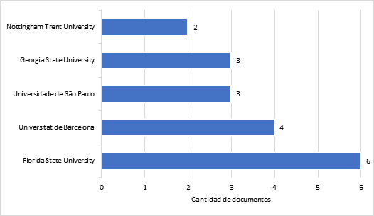 En colaboración con más de 127 instituciones diferentes, se produjeron estas 133 publicaciones. En la figura 2 se muestran las instituciones que elaboraron el mayor número de trabajos académicos a lo largo del periodo de estudio. Entre ellas, se encuentran seis publicaciones de la Florida State University, cuatro de la Universitat de Barcelona y tres de la Universidade de São Paulo y de la Georgia State University respectivamente.