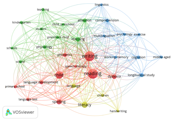 Por su parte, los artículos académicos representaron el 88% de las publicaciones. El campo de las ciencias sociales representó el 39%, la psicología el 20% y las artes humanas el 16%. Según la investigación de palabras clave de VOSviewer, el término “writing” apareció 32 veces, lo que lo convierte en uno de los términos más relevantes. No obstante, “literacy”, “learning” y “cognition” también desempeñan un papel importante.