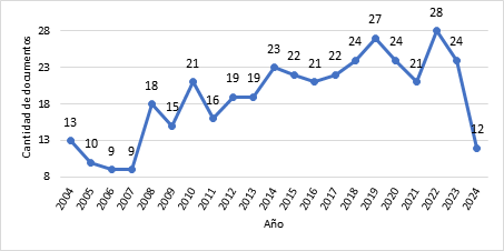 Los datos utilizados en este análisis abarcan el periodo 2004-2024. Asimismo, el desarrollo de la conciencia fonológica en el aprendizaje de la lectura en nivel inicial y los temas relacionados tuvieron la mayor concentración de trabajos de investigación entre 2018 y 2023, según las estadísticas.
