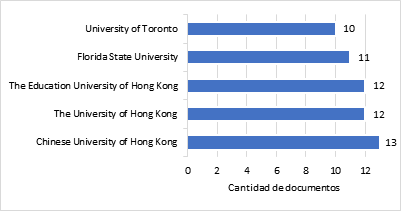 Estos 397 documentos fueron un esfuerzo en conjunto con académicos de más de 128 universidades participantes. La figura 2 muestra las instituciones académicas que más trabajos produjeron durante el periodo de investigación. Entre ellas, se encuentran Chinese University of Hong Kong con 13 publicaciones, The University of Hong Kong y The Education University of Hong Kong con 12 respectivamente y Florida State University con 11 publicaciones.