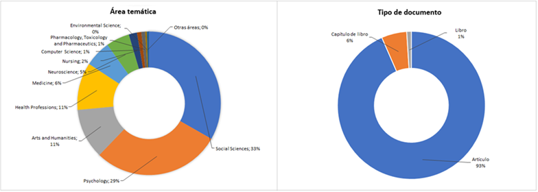 En la Figura 3 se presenta un resumen de los estudios relacionados con el desarrollo de la conciencia fonológica en el aprendizaje de la lectura en nivel inicial para los años 2004-2024. Gran parte de la investigación reciente en este campo se ha originado en las ciencias sociales (33%), con un 29% en psicología y un 11% en artes y humanidades. Además, la producción se distribuye de la siguiente manera: 93% en artículos científicos, 6% en capítulos de libros y 1% en libros.