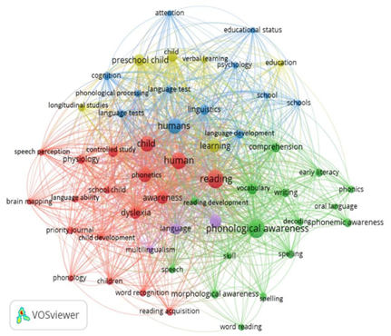 Por otra parte, la mayoría de las publicaciones (93%), consisten en artículos académicos. Los porcentajes corresponden a las ciencias sociales (33%), la psicología (29%) y las artes y humanidades (11%). Un análisis de los datos de palabras clave de VOSviewer reveló que “phonological awareness” figuraba entre las frases más relevantes, con 48 apariciones. No obstante, “reading”, “humans”, “language” y “learning” también desempeñan un papel importante.
