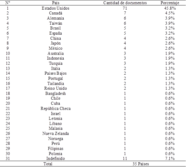 En la tabla 1, se muestra un resumen de la producción científica de los 35 países seleccionados e incluye información sobre aquellos con mayor número de publicaciones en el tema. Estos datos revelan que Estados Unidos, representó el 45.8% (n=71) de los trabajos publicados, Canadá el 4.5% y otras naciones como Alemania y Taiwán, aportaron el 3.9% cada una. Además, la lengua inglesa representó el 85.6% de las publicaciones, mientras que las lenguas española y portuguesa representan el 10.8% y el 3.6%, respectivamente.