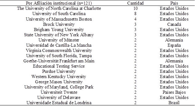 El total de 139 documentos científicos ha sido posible gracias a colaboradores de 121 instituciones diferentes. En la Tabla 3, se puede observar cuáles son las principales universidades que más han publicado sobre el tema de la evaluación formativa en primaria (20 en total). La Universidad de Carolina del Norte en Charlotte es la que más artículos ha publicado (n = 10), seguida por la Universidad de Carolina del Sur, con ocho, y de la Universidad de Massachusetts Boston, con cuatro. En cuanto a la nación de origen de las principales instituciones examinadas, catorce son estadounidenses, una canadiense y una brasileña (en América). Entre las instituciones europeas hay una española, dos alemanas y una de Países Bajos.