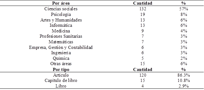 La tabla 5 ofrece un listado de todas las publicaciones que abordan la evaluación formativa en niños de primaria desde 2000 hasta 2024, organizadas según el área temática y el tipo de publicación. De las 20 categorías examinadas, el 57% pertenecen a la literatura científica en ciencias sociales y el 8% a la psicología, según las estadísticas. Además, los resultados desglosados por tipo de documento muestran que; el 86.3% del total son artículos científicos, el 10.8% son capítulos de libros y el 2.9% son libros.