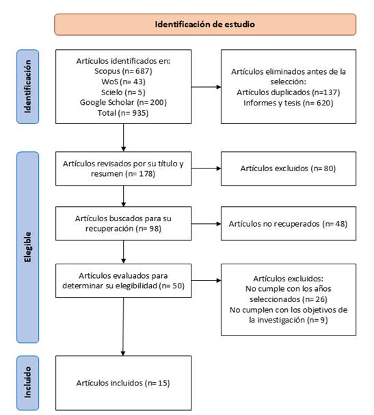 El proceso de selección implicó tres etapas de análisis. Para la etapa de identificación, se recuperaron 935 artículos. Luego, después de excluir determinados documentos por duplicación o por no ser artículos científicos, se recuperaron 178 documentos. En la etapa de elegibilidad, se examinó en detalle el título, el resumen y el cuerpo de cada artículo, lo que culminó en la etapa de inclusión, donde se seleccionaron 15 artículos, los cuales fueron relevantes para la revisión sistemática. Este procedimiento garantizó y aseguró que los estudios seleccionados contenían información adecuada y pudieran ser útiles para cumplir con los objetivos de este estudio en particular.