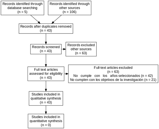Durante la etapa de análisis, se evaluaron 106 artículos, de los cuales se utilizaron 43 en la sección de resultados y discusión, al cumplir con los criterios de relevancia y concordancia con los objetivos del estudio.