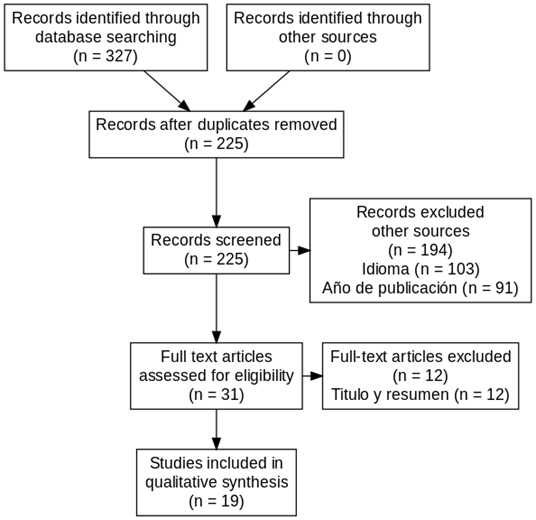 En total, la búsqueda inicial arrojó 327 referencias. Durante la etapa de depuración se eliminaron 102 duplicados. En el cribado inicial, se excluyeron 194 publicaciones por no cumplir con los criterios de inclusión, principalmente en cuanto al año de publicación y el idioma. Esto dejó un total de 31 fuentes para una segunda evaluación. Tras la lectura completa de los textos, se excluyeron 12 estudios por falta de adecuación a los objetivos del presente trabajo. Finalmente, se incluyeron 19 estudios que cumplían con los estándares metodológicos y temáticos requeridos.