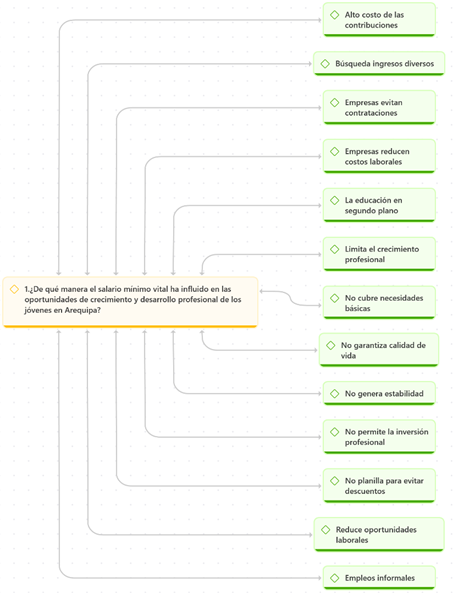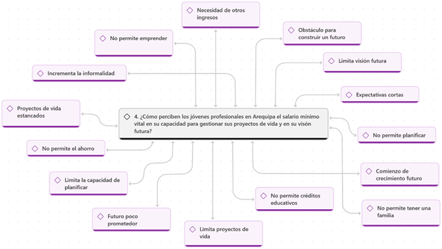 Desde la perspectiva de los jóvenes profesionales, en el ámbito laboral, se identificó que las empresas enfrentan altos costos asociados a los beneficios sociales, lo que las lleva a reducir contrataciones. Los jóvenes manifiestan que la remuneración mínima vital (RMV) es insuficiente, por lo que recurren a ingresos adicionales. Además, la educación queda relegada a un segundo plano, ya que esta limitación salarial dificulta el crecimiento profesional, afectando la posibilidad de acceder a especializaciones, maestrías y otros estudios avanzados. En efecto, la RMV no cubre las necesidades básicas, no garantiza una calidad de vida adecuada ni estabilidad, y tampoco permite la inversión en el desarrollo profesional. En algunos casos, los trabajadores evitan estar en planilla para eludir descuentos, lo que reduce las oportunidades laborales formales y fomenta la informalidad. Sin embargo, Samoliuk et al. (2021) señalan que, desde una perspectiva profesional, la RMV puede impulsar a las empresas a modernizarse, invertir en capacitación y reorganizarse para ser más competitivas, mejorando así la productividad laboral. Por otro lado, Schaitberger (2024) sostiene que el aumento de la RMV no contribuye significativamente al gasto social.