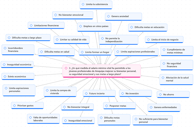 En cuanto a la tercera pregunta, sobre cómo la RMV afecta el ámbito personal, las respuestas indicaron que los jóvenes profesionales enfrentan diversas dificultades para alcanzar sus metas personales, ya que la RMV resulta insuficiente para garantizar su bienestar. En algunos casos, esta insuficiencia económica incluso contribuye al desarrollo de enfermedades y afecta negativamente su salud mental, debido a la inseguridad financiera que limita el cumplimiento de objetivos tanto a corto como a largo plazo.