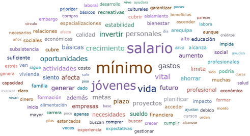 En el plano personal, se observan palabras como “afecta”, “metas”, “gastos”, “limita”, “ahorro”, “invertir” y “planificar”, las cuales indican que la RMV impacta negativamente en las metas personales de los jóvenes. Los gastos mensuales para cubrir necesidades básicas restringen su capacidad de ahorro, inversión y planificación.