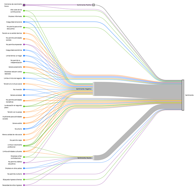 Por otro lado, con sentimiento neutro, emergieron expresiones como “búsqueda de ingresos diversos”, “empleos en otros países”, “empresas evitan contrataciones”, “expectativas cortas”, “incertidumbre financiera”, “limita actividades culturales”, “limita aspiraciones personales y profesionales”, “limita el crecimiento profesional”, “limita la capacidad de planificar”, “limita la compra de vivienda”, “limita proyectos de vida”, “limita vida social activa”, “limita visión futura”, “necesidad de otros ingresos”, “no genera estabilidad”, “no permite créditos educativos”, “no permite el ahorro”, “no permite planificar”, “no permite reuniones sociales”, “no es suficiente para el bienestar personal”, “obstáculo para construir un futuro”, “preocupación económica”, “priorizar gastos” y “proyectos de vida estancados”.