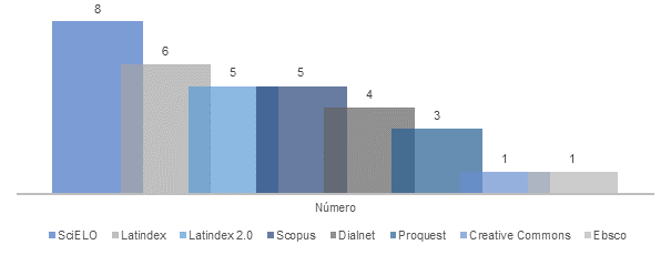 A partir de la Figura 1, se puede observar que en SciELO se identificaron 8 artículos, lo que representa el 24% del total, siendo esta base la que alberga el mayor número de publicaciones de alto nivel. SciELO tiene como objetivo principal promover la visibilidad y el acceso gratuito a la producción científica. En segundo lugar, se encuentra Latindex con 6 artículos (18%), seguido por Latindex 2.0 con 5 artículos (15%) y Scopus también con 5 (15%). Por su parte, Dialnet aporta 4 artículos (12%), ProQuest 3 (9%) y Creative Commons y EBSCO con 1 artículo cada una (3%).