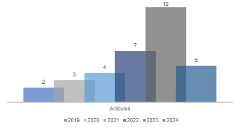 Los artículos fueron organizados en una tabla matriz (Tabla 1), que incluyó información sobre título, autor, año, país y fuente indexada, facilitando así su trazabilidad y categorización. El análisis se complementó con representaciones gráficas que permiten visualizar la distribución de los documentos según diversos criterios.