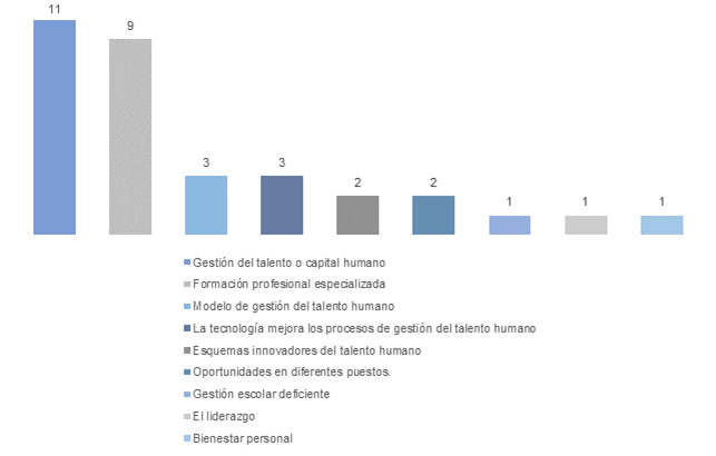 Finalmente, la categoría más abordada fue “gestión del talento o capital humano”, con once artículos. Los estudios destacan la importancia de implementar políticas de planificación, establecer modelos de gestión sostenibles y fomentar climas organizacionales saludables (Carvajal-Pérez, 2021; González & Pedraza, 2021; Idrogo et al., 2022; Huaraca-Carhuaricra, 2023; Chávez et al., 2023; Realpe-Bolaños, 2020; Pisco et al., 2021; Conrado et al., 2021; Mendivel et al., 2020; Canqui et al., 2022; Párraga & Macías, 2023). La gestión del talento se presenta como un proceso estratégico con incidencia directa en la productividad académica y el desarrollo institucional. En síntesis, se evidencia que los temas más desarrollados son los relacionados con el capital humano y la formación profesional, mientras que aspectos como el liderazgo, el bienestar y la gestión escolar efectiva tienen una menor presencia en la literatura reciente.