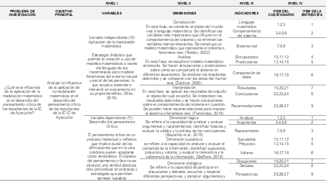 Como técnica principal se utilizó una encuesta estructurada (Hernández & Mendoza, 2018). El instrumento constó de dos cuestionarios tipo Likert, con 18 ítems distribuidos en tres dimensiones, validados mediante juicio de expertos y con un coeficiente de confiabilidad alfa de Cronbach superior a 0.80 en la prueba piloto. El primer cuestionario midió la aplicación de la modelación matemática, abarcando las dimensiones de construcción, análisis e interpretación; mientras que el segundo evaluó el pensamiento crítico, considerando sus dimensiones: lógica, sustantiva y dialógica.