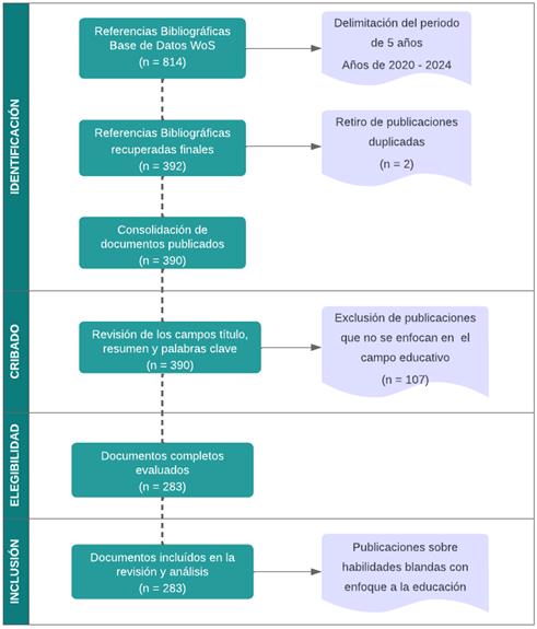 Se incluyeron estudios publicados en los últimos cinco años para garantizar la actualidad de la información recopilada. Respecto a los criterios de exclusión durante el proceso de selección de las publicaciones, se excluyeron aquellos estudios que no estuvieran relacionados directamente con el desarrollo de habilidades blandas enfocados a la educación (Moher, 2022), así como aquellos que no cumplían con los estándares de calidad metodológica requeridos para la revisión sistemática.