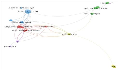 En la Figura 2, se observan cuatro nodos que indican que se están desarrollando coautorías con conexiones entre investigadores influyentes pertenecientes a instituciones ubicadas en diversos países de todo el mundo. El clúster de color azul, con mayor presencia, está liderado por la Stanford University, que colabora en temas de habilidades blandas con su similar, la Vrije Universiteit Amsterdam, representada por el clúster rojo. Ambas forman comunidades o redes de investigación. El University of California System representa el clúster verde, trabajando en colaboración con las dos anteriores.