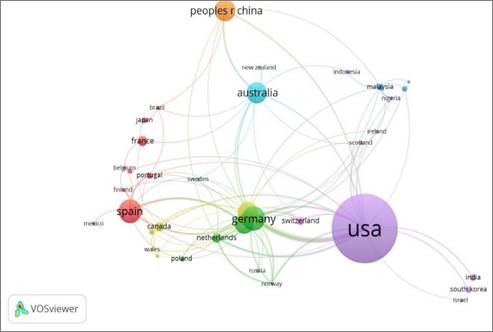 En la Figura 3, se puede observar que Estados Unidos, que forma parte del clúster morado, es el país de los autores con mayor presencia en las publicaciones realizadas con autores de diversos países. Las instituciones estadounidenses están más conectadas y se entiende que son las más influyentes en las investigaciones sobre habilidades blandas en educación, lo que puede evidenciar su liderazgo y reconocimiento en el campo. En esa línea, el segundo clúster verde está representado por instituciones alemanas que colaboran con Rusia, Países Bajos, Noruega, entre otros.