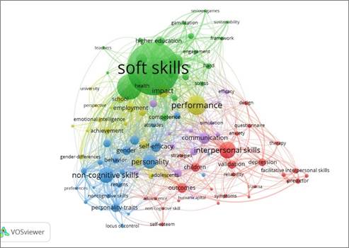 Finalmente, se analiza la coocurrencia temática de las habilidades blandas en la educación. En la Figura 5, se observa la predominancia del tema de las habilidades blandas propiamente (clúster verde) en comparación con otros términos relacionados, como habilidades no cognitivas (clúster azul) o habilidades interpersonales (clúster rojo). Además, se identifican subtemas y enfoques diversos por los que se abordan estas habilidades. La imagen revela que dentro de las habilidades blandas se están investigando diversas problemáticas en la educación superior, como el estrés de los estudiantes universitarios y métodos de aprendizaje innovadores, como la gamificación. De manera similar, las habilidades interpersonales son objeto de investigaciones que abordan problemas de depresión, terapia y otros traumas, buscando soluciones efectivas.