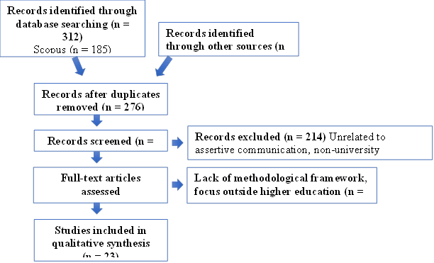 En cuanto a los criterios de inclusión, se consideraron únicamente los artículos que: (a) abordaran la comunicación asertiva con enfoque explícito en contextos universitarios, (b) presentaran una metodología claramente definida, (c) hubieran sido sometidos a evaluación por pares y (d) reportaran resultados verificables. En contraste, se excluyeron artículos duplicados, documentos sin metodología explícita y aquellos centrados en niveles educativos distintos al universitario o en entornos ajenos a la educación superior.