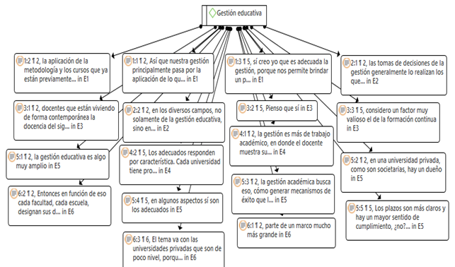Se analizaron todas las respuestas de los participantes, centrándose posteriormente en aquellos aspectos relacionados directamente con el objetivo principal del estudio. Dentro de estos, se destacó que para evaluar la gestión educativa es fundamental comprender cómo esta se lleva a cabo por parte de los docentes y si consideran que los procesos de gestión son adecuados. La mayoría de los entrevistados coincidió en que la gestión educativa implica la discusión de diversos temas, siendo uno de los más relevantes la necesidad de alcanzar un acuerdo entre los profesores que imparten el mismo curso respecto a la uniformidad de los materiales. Aunque cada docente posee la libertad de incorporar contenido adicional en sus clases, debe respetar un patrón uniforme. Esto se evidencia en el testimonio del entrevistado 1: “Una vez que se ha desarrollado, el material se socializa y distribuye a todos los profesores que participarán en la enseñanza, quienes pueden añadir material complementario específico antes de su aplicación. Por lo tanto, el objetivo es que la administración sea homogénea”.
