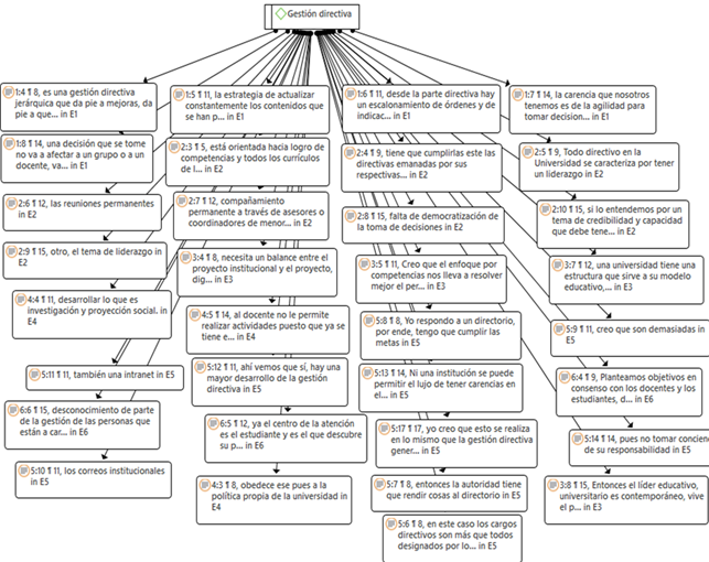 El primer objetivo específico se abordó mediante el análisis de las respuestas enfocadas en la evaluación de la administración directiva, la cual se segmentó en tres secciones. En la primera sección, se destacó que los propietarios de las universidades y sus equipos de alto nivel encargados de la administración coinciden en que el currículo debe ser diseñado por carrera y que se alcanzan los objetivos establecidos en cada universidad privada, respetando los pilares fundamentales de la organización. Resulta relevante la perspectiva del entrevistado 5, quien señaló: “La administración directiva, como mencioné, usualmente cuenta con una asamblea universitaria y un consejo universitario, pero en esta situación los puestos directivos son, en su mayoría, designados por los propietarios. Existen dueños que determinan y poseen un impacto muy significativo en las decisiones tomadas por los órganos de gobierno”.