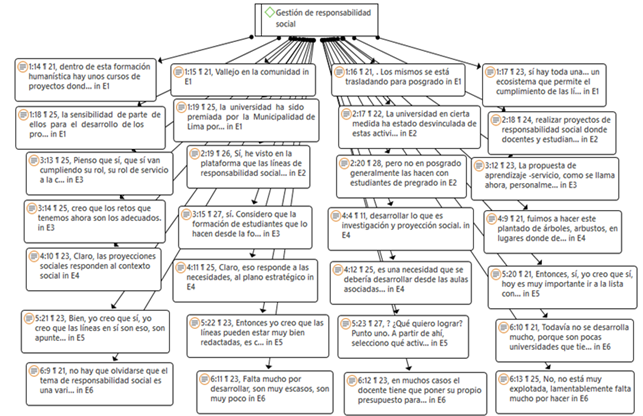 Por otro lado, los entrevistados coinciden en que, aunque las estrategias de responsabilidad social son relevantes, es importante diferenciar claramente entre proyección social y responsabilidad social, dado que la primera se contempla de manera teórica, mientras que la segunda se aplica en la práctica. A continuación, se presenta la red de citas correspondiente que ilustra este objetivo.