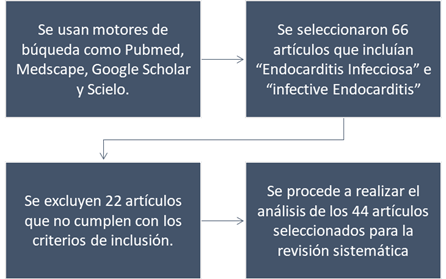 Se realizó una búsqueda bibliográfica enfocada en endocarditis infecciosa en adultos, sobre artículos de investigación publicados entre los años 2020-2022; se utilizaron motores de búsqueda como Pubmed, Medscape, Google Scholar y Scielo; ésta búsqueda fue limitada a artículos escritos en idiomas Español e Inglés; se utilizó como filtro de búsqueda el tiempo que comprende los años antes mencionados. Se utilizaron como palabras claves para la búsqueda el término “Endocarditis Infecciosa”, “Infective Endocarditis”; de los cuáles se seleccionaron 66 artículos, entre ellos se incluyen revisiones sistemáticas, metanálisis, series de casos, artículos originales observacionales, descriptivos, retrospectivos, y multicéntricos. Tres revisores de forma independiente realizaron la revisión de títulos y resúmenes de la totalidad de los artículos, excluyendo 22 de éstos, por tratar temas enfocados en endocarditis infecciosa en pacientes pediátricos, aquellos enfocados en la rama de veterinaria; artículos duplicados, aquellos que trataban solamente de endocarditis cardiaca no infecciosa, aquellos escritos en idiomas diferentes al español e inglés y aquellos a los cuáles no se pudo obtener acceso; se resume en la figura 1.