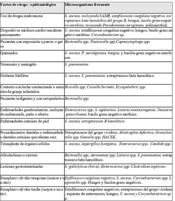 Es importante destacar que la literatura reporta casos de microorganismos no habituales, como por ejemplo especies de Klebsiella, en donde se observa que la más común es la K. pneumoniae en el 76,3%, seguida de K. oxytoca en un 20,3%21; también se han reportado casos de EI causada por gonococo, pero en la actualidad es considerado como una de las etiologías más infrecuente22. En este mismo orden de ideas, existen reportes de Kytococcus schroeteri23, Nocardia spp24, Enterococcus spp24, Brucella spp25, Moraxella spp26 Por último, es importante resaltar que en la Tabla 1 se resumen los microorganismos más frecuentes dependiendo de los factores de riesgo y epidemiológicos del paciente26.