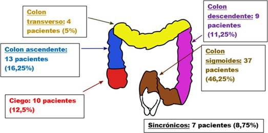 La localización de los tumores se muestra en la figura 1. El tipo histopatológico más frecuente fue el adenocarcinoma en 78 casos (97,5%) y solo dos pacientes presentaron carcinomas neuroendocrinos (2,5%). La frecuencia de los estadios de cáncer de colon de nuestra serie se muestra en la tabla 1.