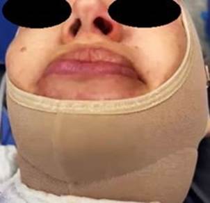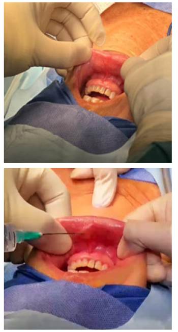 Para la intervención quirúrgica de tipo TOETVA, una vez realizada la extensión cervical requerida, se procedió a la exploración del vestíbulo bucal, seguidamente se realizó infiltración de 10 cc de solución 0,9% y una incisión con bisturí, a 1,5 cm de la unión gingivolabial de 11 mm (Figuras 1 y 2).