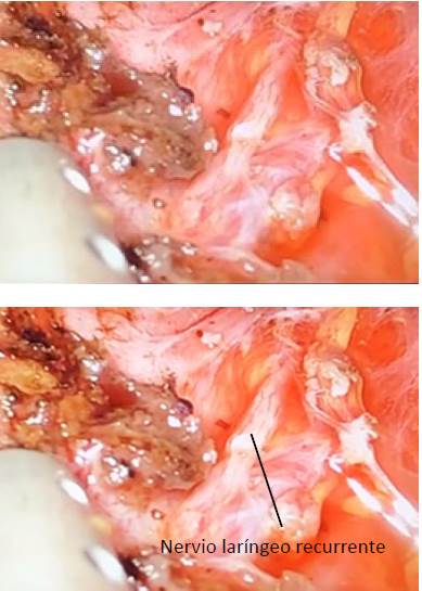Figuras 12 y 13 En la imagen tomada de la cirugía endoscópica, se observa el nervio laríngeo recurrente de color pardo.