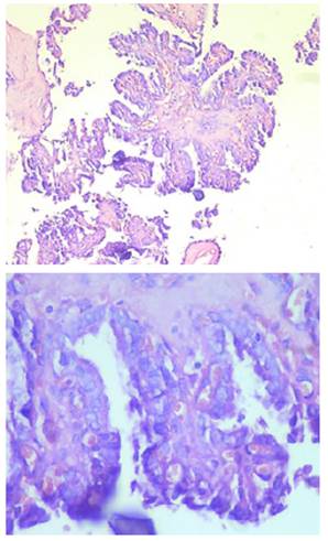 Figura 15: Corte histológico de la pieza anatómica, donde se observa: contorno nuclear irregular, pseudoinclusiones nucleares y el aspecto claro y vidrioso en el núcleo de las células foliculares en el carcinoma papilar de la glándula tiroides.
