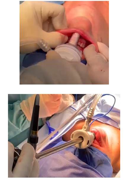 De manera similar a la técnica TOETVA, se realizó infiltración de 10 cc de solución 0,9% y una incisión con bisturí, a 1,5 cm de la unión gingivolabial de 11 mm. Posteriormente se realizó la disección con crille curvo hacia mandíbula, se continuó la hidrodisección con aguja de Veress e inyectadora, hacia la línea media de la región cervical, luego se disecó el espacio con bujías de Hegar aumentado progresivamente el tamaño de las mismas y disecando el canal en la línea media. Luego se procedió a la colocación de trocar de 11 mm en la incisión, dirigido a la línea media. Se colocó insuflador con CO2 a una presión de 6 mmHg, con flujo de 12 L/ minuto. Se realizaron las dos incisiones laterales y se colocó trocar de 5 mm en cada una, con el posterior posicionamiento del equipo médico (Figuras 18, 19 y 20).