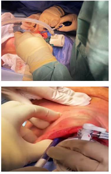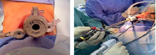 Figura 5 y 6: Colocación de trocar de 11 mm en la incisión, dirigido a la línea media donde se ubica la cámara