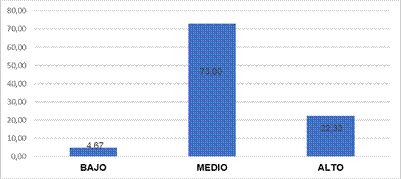 Según los datos presentados en la figura 3, el 96,00 % de los encuestados se ubica en un nivel bajo, el 3,67 % en un nivel medio y solo el 0,33 % en un nivel alto. Estos resultados permiten concluir que la motivación hacia la lectura, en la mayoría de los estudiantes, se encuentra en un nivel bajo.