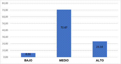 Según los datos representados en la Figura 1, el 73,00 % de los estudiantes se encuentra en un nivel medio de manejo tecnológico, el 22,33 % en un nivel alto y solo el 4,67 % en un nivel bajo. Esta distribución sugiere una tendencia general hacia una competencia tecnológica moderada, lo cual refuerza la pertinencia de incorporar prácticas docentes que acompañen y potencien dicho nivel de alfabetización digital. Mientras que en la FDe acuerdo con los resultados mostrados en la figura 2, el 70,67 % de los participantes se encuentra en un nivel medio, el 23,33 % en un nivel alto y el 6,0 % en un nivel bajo. Estos hallazgos sugieren que la comprensión lectora de los estudiantes se sitúa, en su mayoría, en un nivel intermedio.